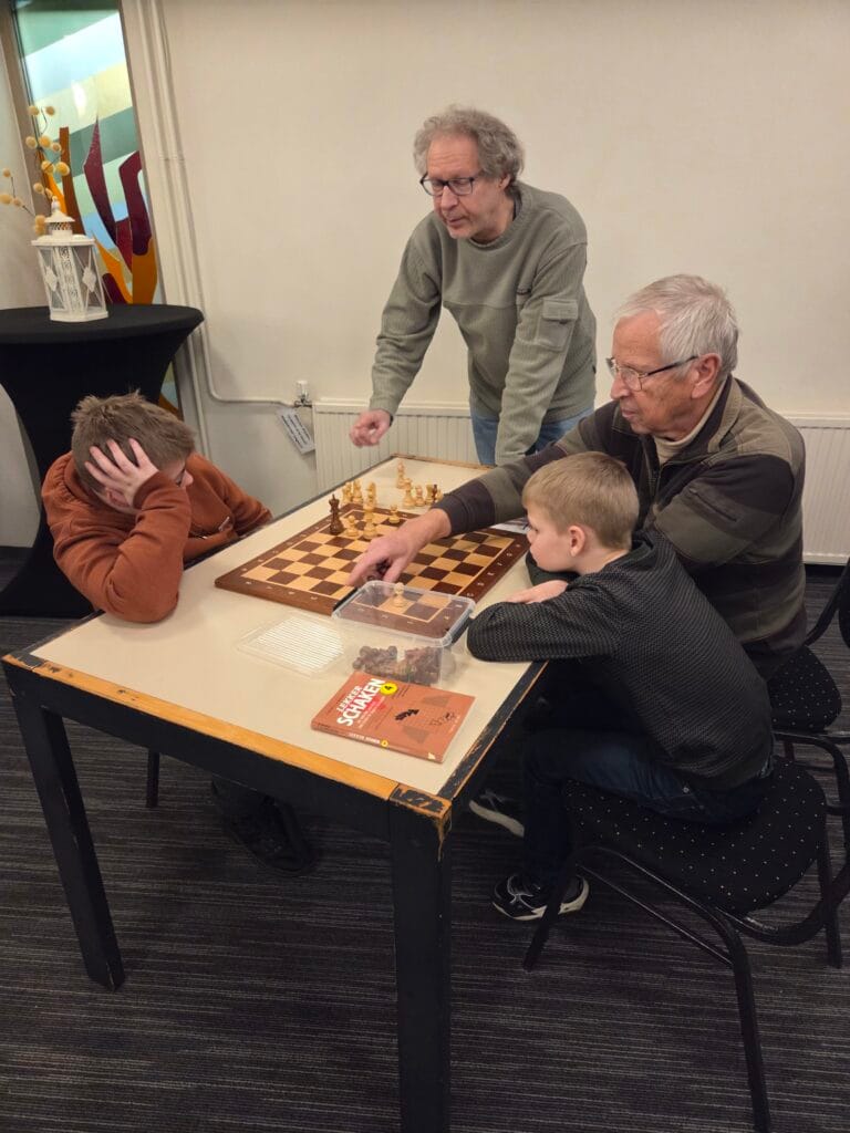 Aandachtig volgen de jongste schakers de aanwijzingen van Jaap Sikken en Jan van der Veen.